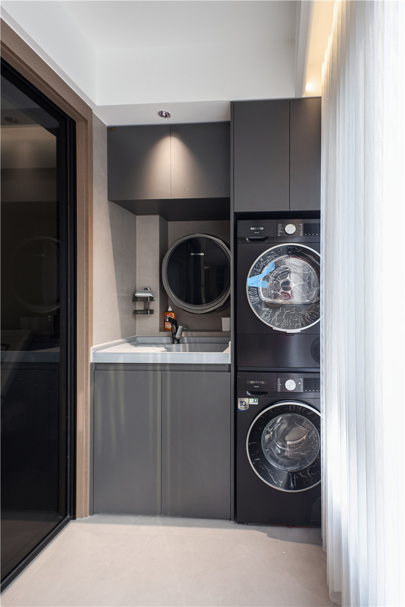 一側(cè)陽(yáng)臺(tái)柜藏露結(jié)合,收納物件的同時(shí)可進(jìn)行DIY裝飾;一側(cè)做洗烘一體式洗漱臺(tái),可與男孩房共用,滿滿設(shè)計(jì)感。