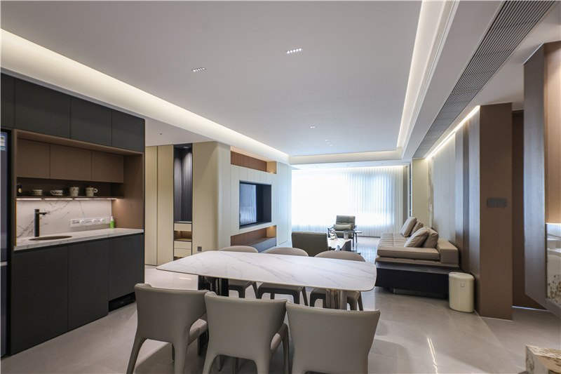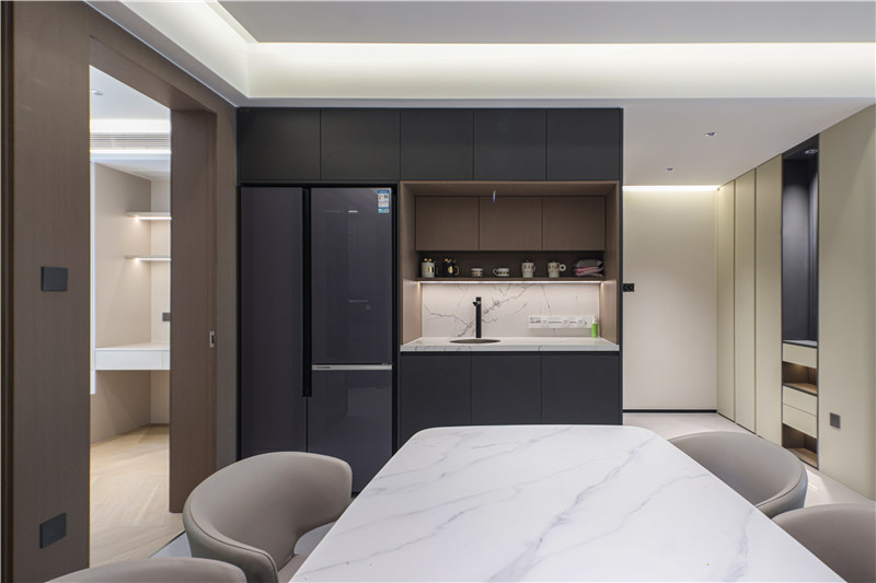 餐邊柜整體無(wú)拉手設(shè)計(jì),將冰箱一整個(gè)嵌入其中,視覺(jué)和諧統(tǒng)一;中部掏空預(yù)留清洗區(qū),上方為餐具開(kāi)放區(qū),便捷實(shí)用;底部留空可放掃地機(jī)器人等電器。