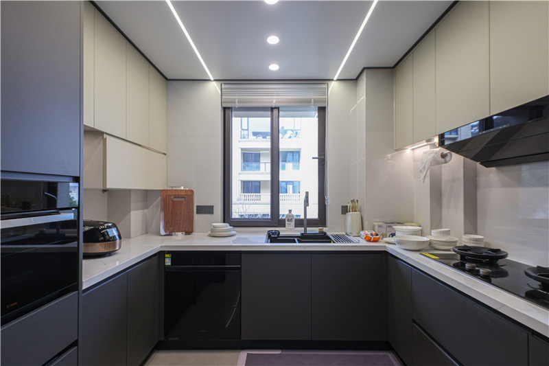 廚房U型構(gòu)造,以洗切烹盛動(dòng)線提升烹飪效率,臺(tái)面巖板材質(zhì)耐磨耐刮防滲水。
