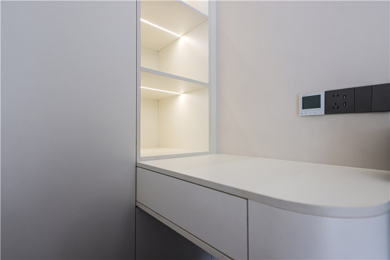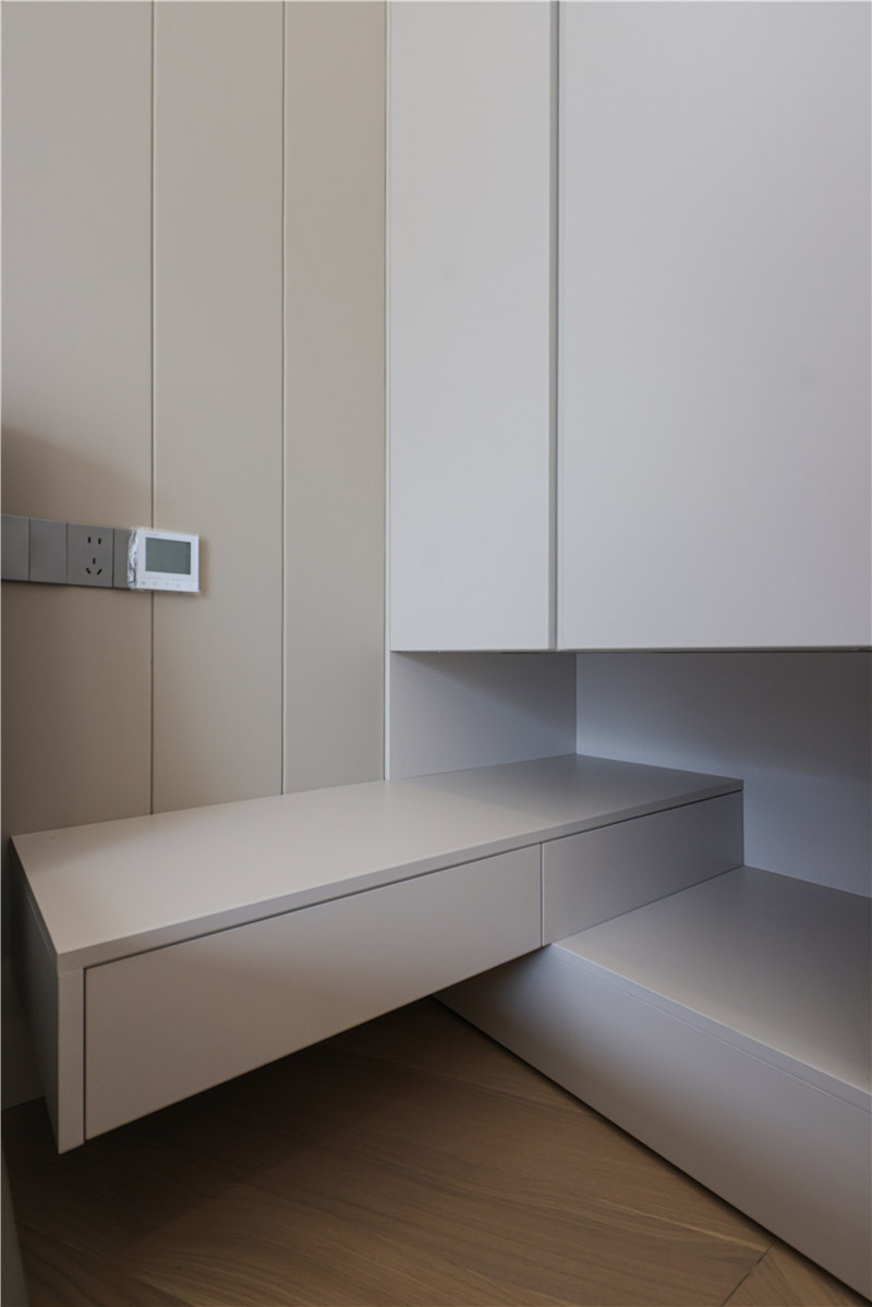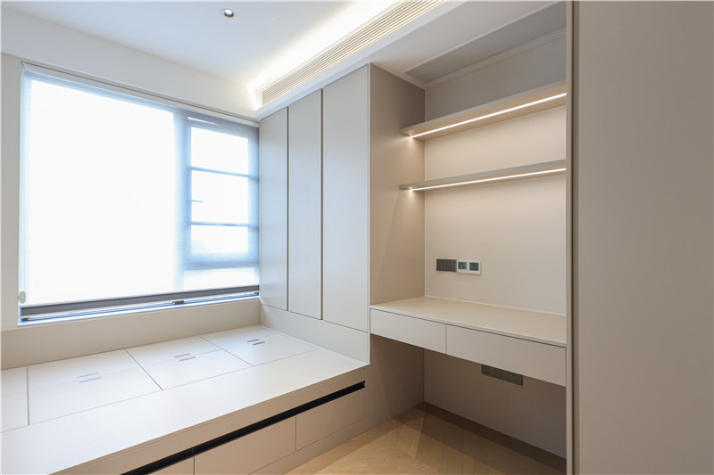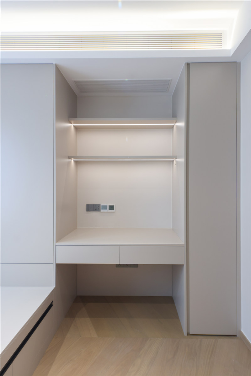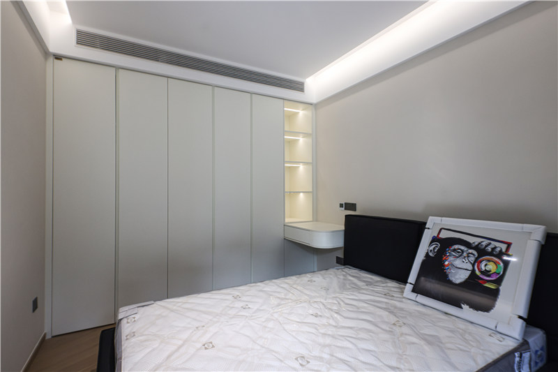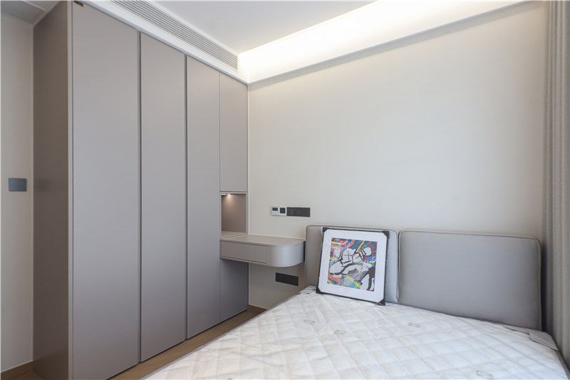 次臥為一體式設(shè)計(jì),床、書(shū)桌、衣柜和諧統(tǒng)一,以銑槽及無(wú)拉手設(shè)計(jì)使得視覺(jué)清爽。