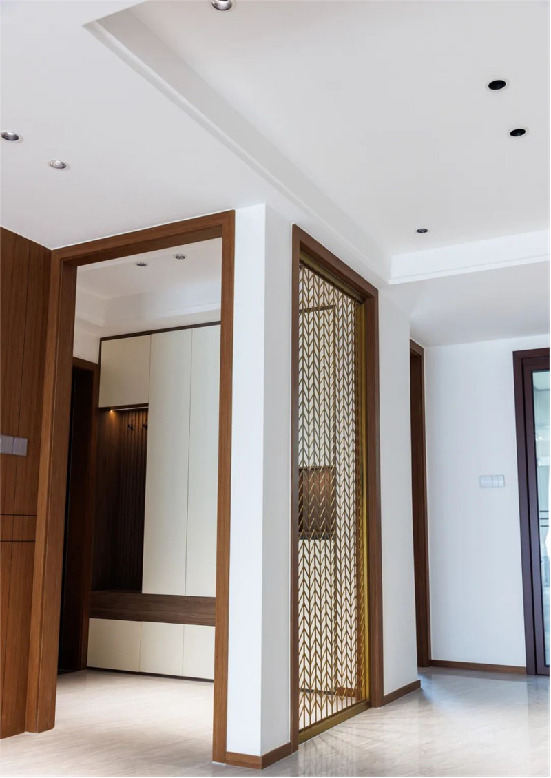 中式氛圍:采用中式常用到的格柵設(shè)計(jì)置于開放區(qū)背板,增加玄關(guān)柜設(shè)計(jì)感,整體簡約不失精致;在玄關(guān)與客廳銜接處采用格柵屏風(fēng),既起到空間分區(qū),呈現(xiàn)初步中式氛圍。
