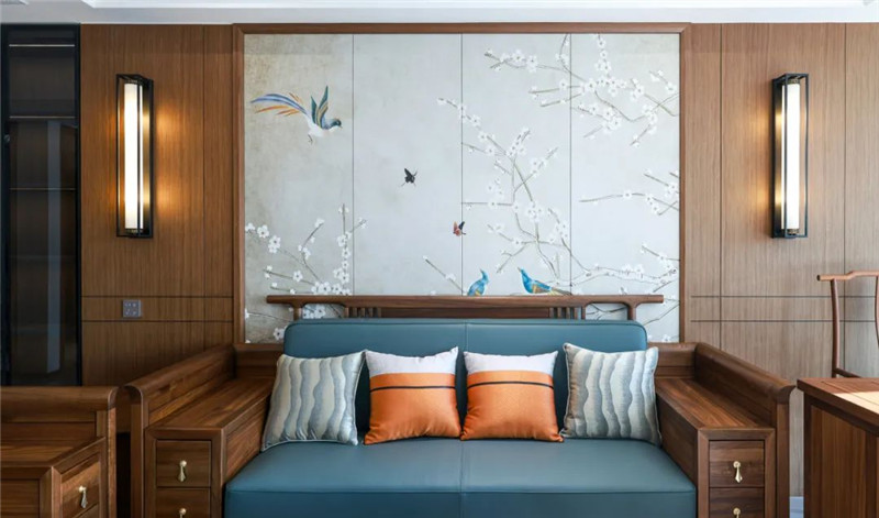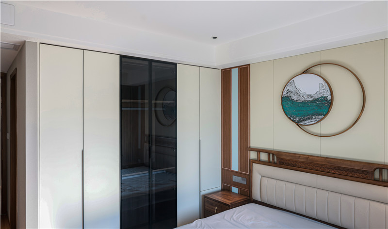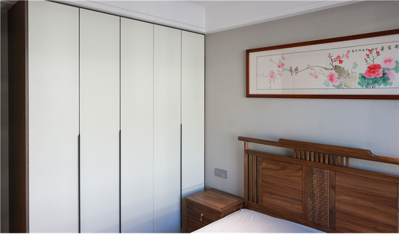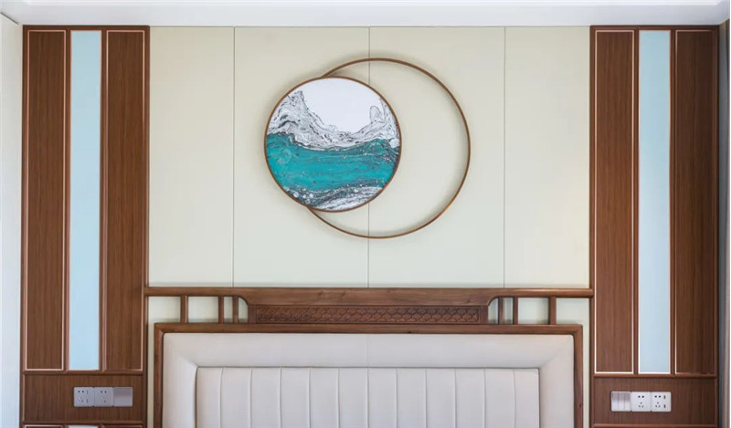 背景墻采用不規(guī)則拼接,實(shí)木與米白的配色經(jīng)典和諧。背景墻中遵循了中式美學(xué)對(duì)稱,簡中有序,整個(gè)臥室洋溢著新中式意境。