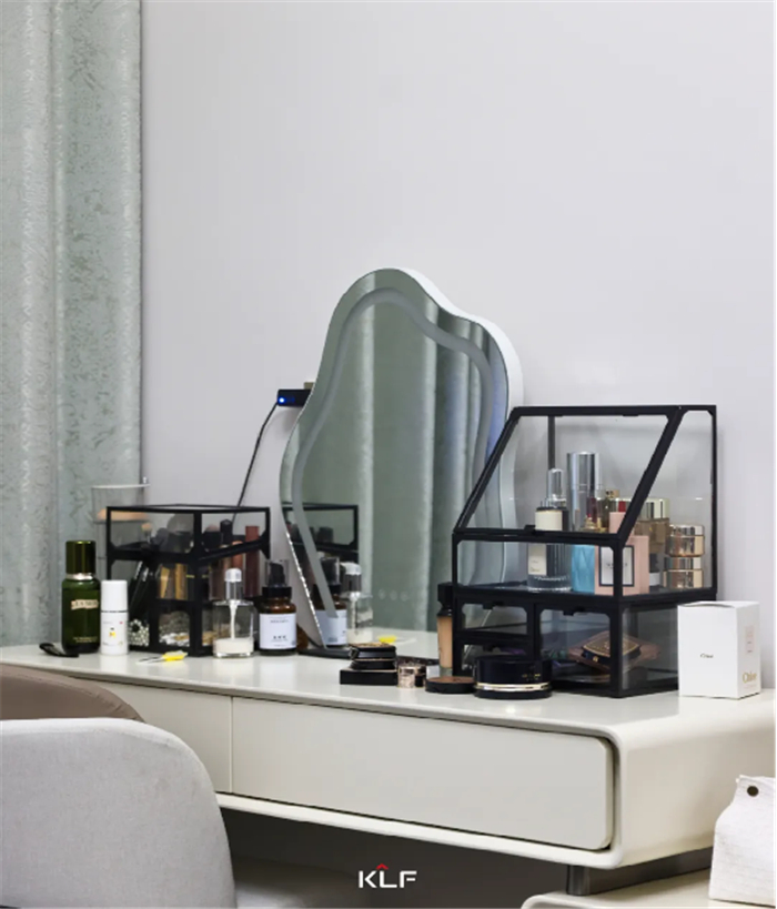 此外,一門到頂衣柜法式復(fù)古拉手等元素設(shè)計(jì),給人一種輕盈、通透的感覺。懸空化妝桌設(shè)計(jì)更為巧妙,視覺更輕盈靈活,更具時尚高級感。
