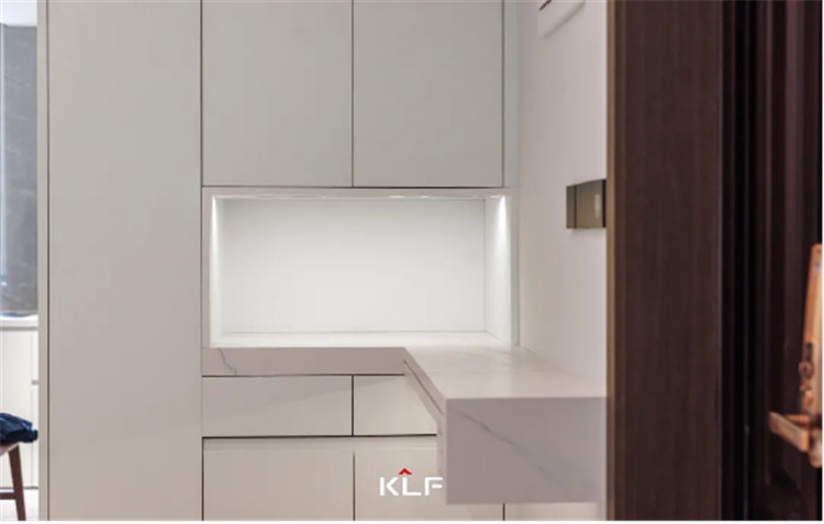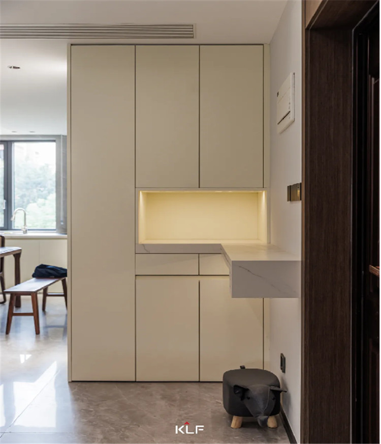 在玄關(guān)為了提升空間利用率,我們采用了嵌入式的柜體進(jìn)行上下分區(qū)收納。中部掏空后延伸大理石臺(tái)面作為置物臺(tái),放置一些小物品都很實(shí)用。