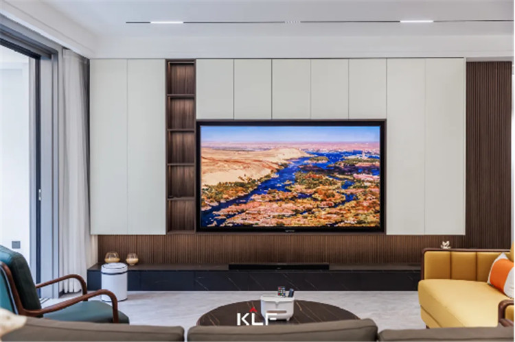 細(xì)格柵的造型墻板為墻面增加了立體感,一字型深灰色地柜直接落地,內(nèi)嵌3D霧化暖爐,帶給家更多溫馨。