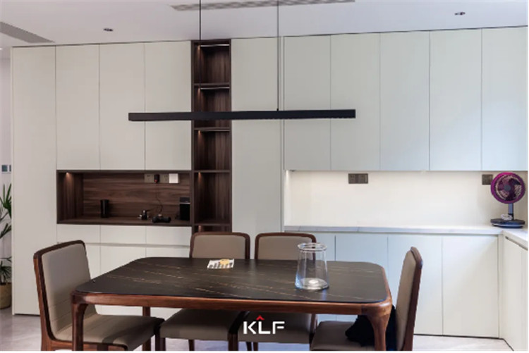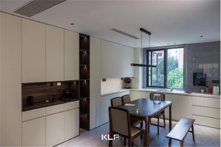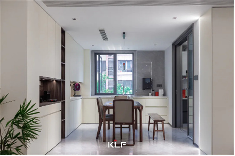 餐廚空間的設(shè)計(jì)風(fēng)格與起居空間保持一致,除了傳統(tǒng)的U型封閉式中廚外,在用餐區(qū)還做了高定全屋圍合的設(shè)計(jì)。