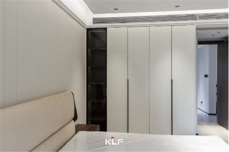 主臥空間延續(xù)一貫簡(jiǎn)約的設(shè)計(jì)手法,注重提升家居質(zhì)感,強(qiáng)調(diào)人文的居住感受。自客廳格柵背景墻延伸至臥室空間,做成一體化的門(mén)套門(mén)框及門(mén)扇。