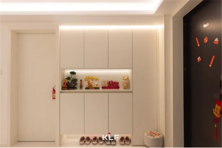 初見這個家,便有種一鏡到底的酣暢感,素雅色彩與洗練線條一路鋪陳,進(jìn)門便跌進(jìn)奶油色系的環(huán)抱中。入戶區(qū)域一側(cè)的奶油色到頂玄關(guān)柜美觀實(shí)用,鏤空設(shè)計(jì)方便進(jìn)出門換衣?lián)Q鞋和放置日常物品。褪下外部世界紛擾,療愈每一顆歸家的心。