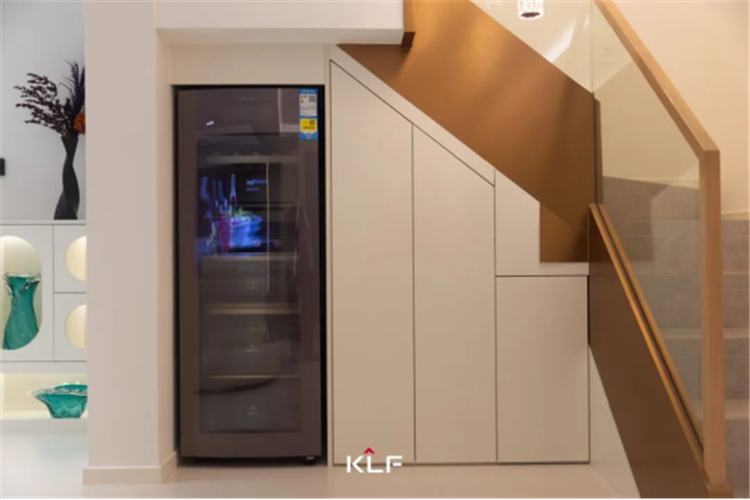 樓梯下方的空間,也被巧妙改造成超大容量的收納柜,滿足一家人多樣化的儲物需求,讓樓梯在承擔(dān)垂直交通功能的同時,變身成為實(shí)用的儲物高手。