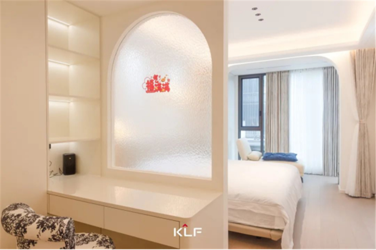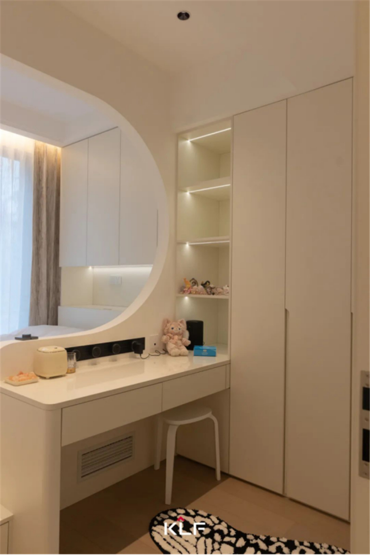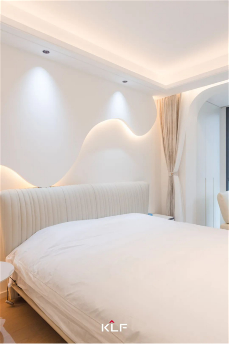 設(shè)計(jì)解鎖更加精簡的生活方式,打造流暢的洄游動線。以柜為墻圍合出一隅衣帽間和梳妝臺,與主臥構(gòu)成嵌套關(guān)系,提升空間利用率和居住便利性。床頭背景墻、門洞埡口、玻璃隔斷,多處采用圓弧線條勾勒輪廓,具體而微的細(xì)節(jié),消弭大面積純色的乏味和單調(diào),交匯成生活的豐富質(zhì)感,滿足居住者的審美期待。