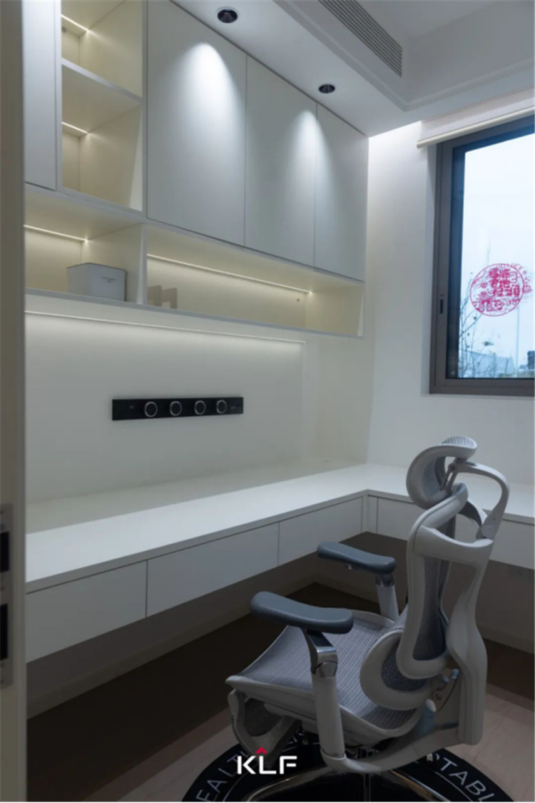 盈于咫尺,乾坤造境。書房是一個能讓人沉浸式思考與放松的理想天地。作為業(yè)主自己的精神空間站,書房靠墻定制吊柜和懸挑書桌,精簡有序、寬敞通透,強(qiáng)大的收納功能將瑣碎盡數(shù)歸置。