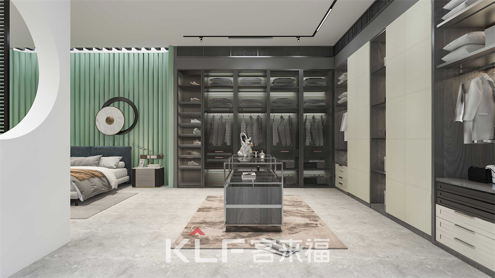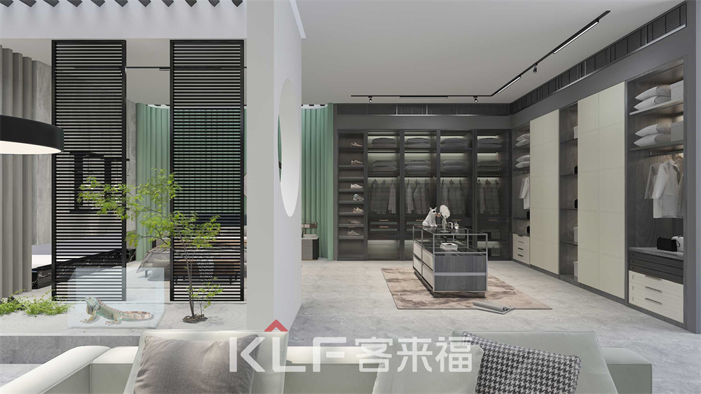 柵欄式背景設(shè)計塑造空間的線條感,灰色磚紋背景色的搭配加上具有藝術(shù)感的掛件,放大了空間的視覺效果。L型的衣帽間安排,衣帽間皮紋門板的運用低調(diào)奢華。采用阻尼軌道,在抽拉時光滑不受阻,給拉開抽屜時順滑的享受。