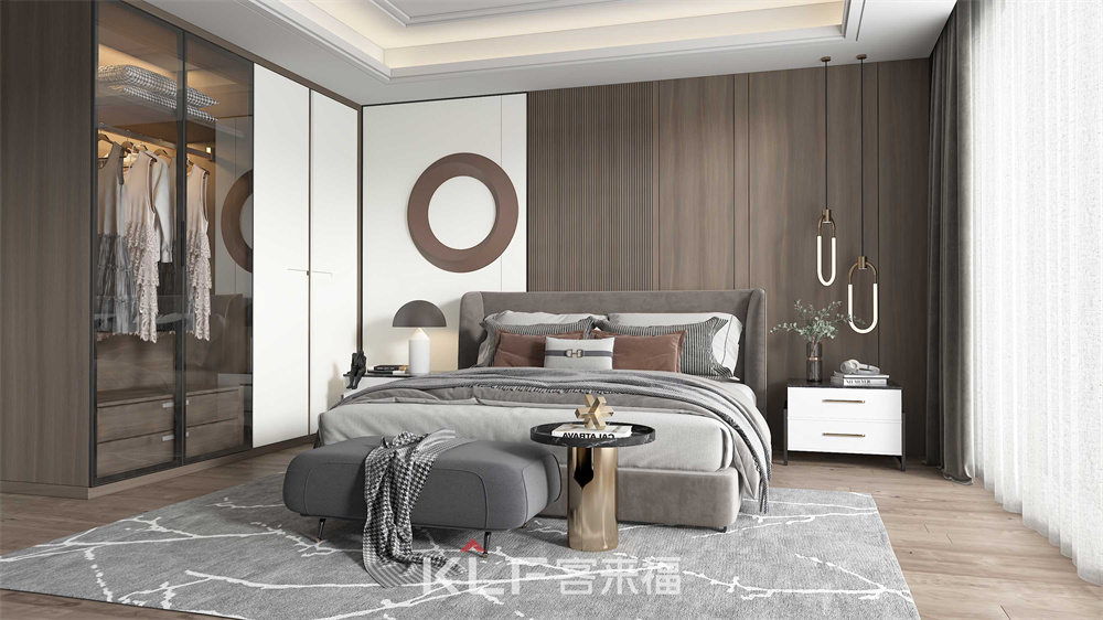 原木色輔以象牙白點(diǎn)綴,讓臥室木質(zhì)感更強(qiáng)的同時(shí),給予色彩基調(diào)的緩沖。半開放式的衣柜滿足日常不同的收納需求,同時(shí)令空間更具通透感。高級(jí)灰的布色調(diào)和空間視覺感,給人一種自然而沉靜的感覺。