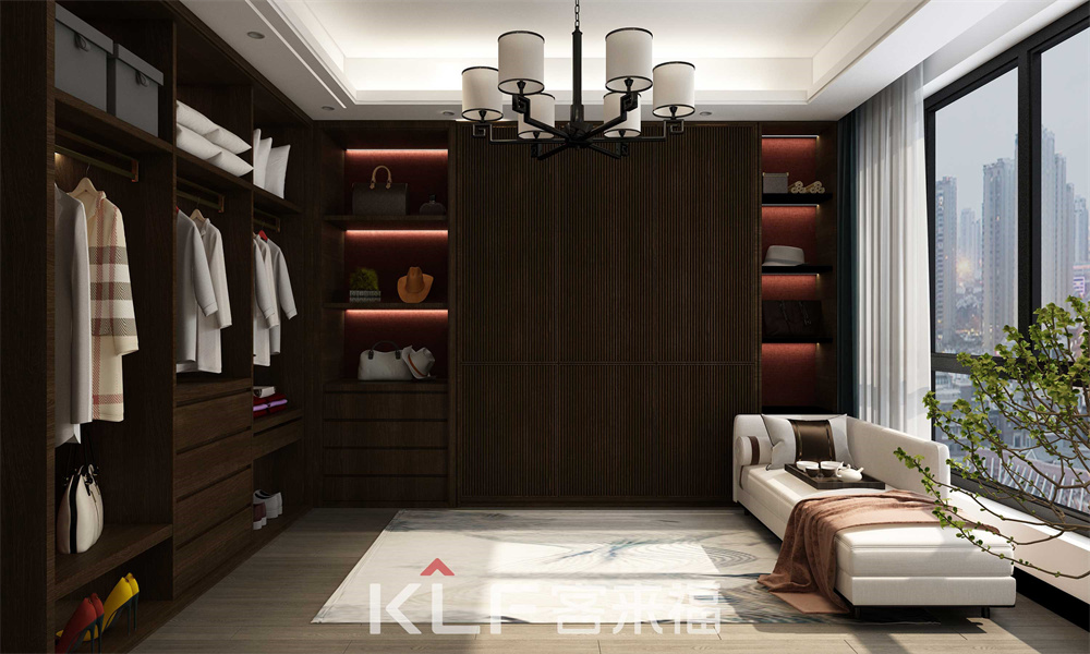 L型靠墻衣柜,藏露參半。中部黃金區(qū)域掛常用衣物,擺放常用物品。頂部鏤空,成就換季衣物,不常用衣物的存儲地。底部根據(jù)家庭成員需求,設(shè)計成抽屜與置鞋區(qū),結(jié)構(gòu)明晰??看暗纳嘲l(fā),讓衣帽間根據(jù)自己意愿,添補功能,如品茶、看書、觀賞等。