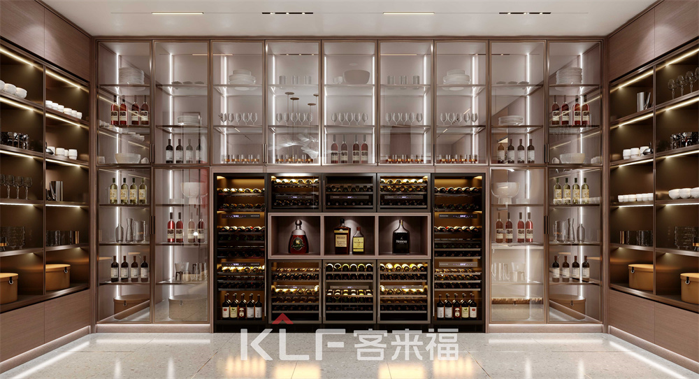 中式酒窖采用了對(duì)稱設(shè)計(jì),左右開放柜,中間運(yùn)用全透明超白玻型材玻璃門,讓酒窖的高端不可言語(yǔ),彰顯出主人對(duì)酒品的熱愛,對(duì)生活的自由向往。