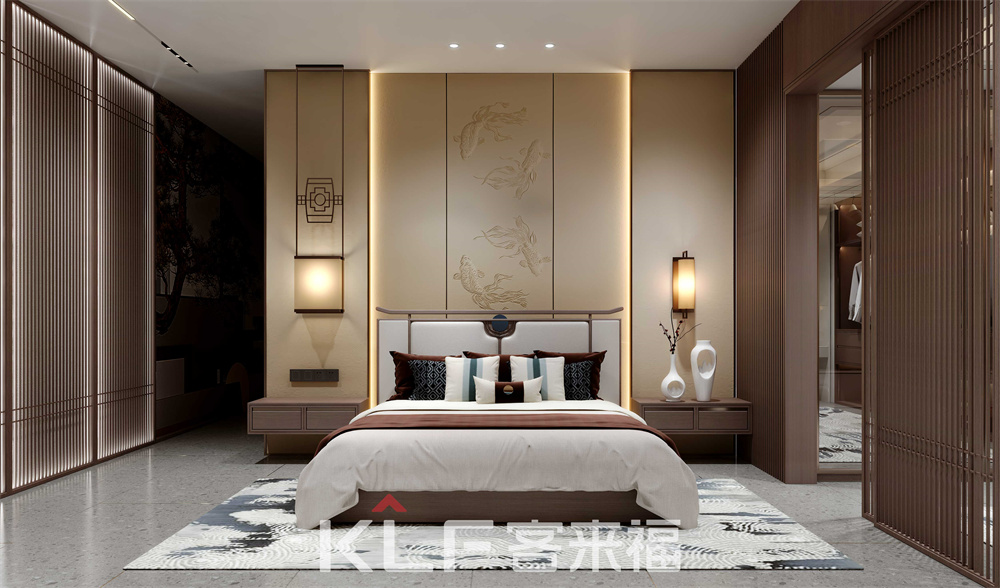 新中式臥室,整體高大整齊,外觀簡(jiǎn)單無(wú)復(fù)雜線條。兩側(cè)對(duì)稱床頭柜,兼?zhèn)湫揎椗c臨時(shí)存放功能,搭配低飽和度燈光,營(yíng)造適眠環(huán)境,保障家庭成員的睡眠質(zhì)量。
