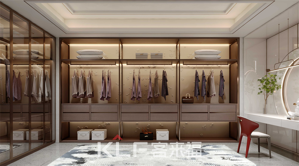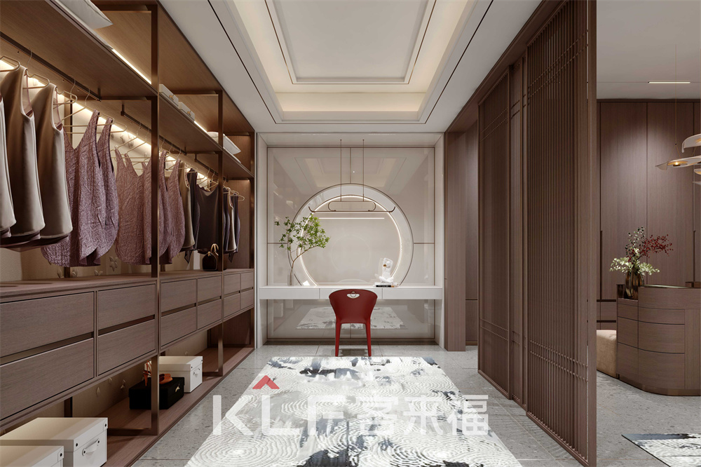 新中式開放式衣帽間,以屏風(fēng)分隔其他空間,打造出一塊相對(duì)的獨(dú)立區(qū)域。背板運(yùn)用皮雕工藝,鋁木型材框架搭配實(shí)木材質(zhì),布局主要存儲(chǔ)區(qū)。底部掏空,增強(qiáng)衣帽間的靈活性,中下部安裝推彈軌道抽屜,觸摸即可抽拉。